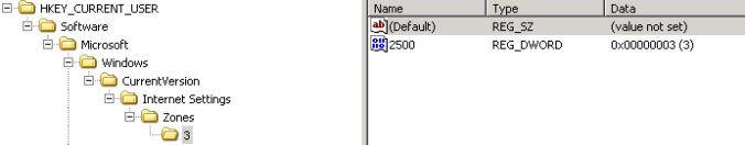 “HKCU\Software\Microsoft\Windows\CurrentVersion\Internet Settings\Zones\3” “2500”=dword:00000003