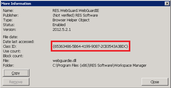 Before we do this we first have to look up the Class ID of the Web Trace BHO by opening the properties of the BHO, the BHO can be found in Internet Explorer under Manage Add-Ons :