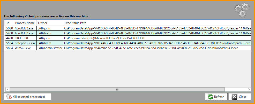 Quickly get an overview of all virtual processes on a machine, also native processes started inside a virtual environment are shown here. You can see which user(s) are associated with the virtual process and the path where the executable is started from. You can also end virtual processes from here. Virtual process overview is very handy in combination with pending tasks, it allows you to easily see which users\processes keeps the package in use.