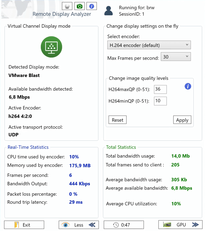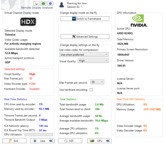 If you are new to Remote Display Analyzer (RDA), this tool will help you understand your remote display configuration and it’s behavior, it will only show you relevant information and help you decide which setting is the best for your specific use case. It’s also very handy for troubleshooting remote display configurations. RDA is just a portable executable without any installation needed, just run it in your remote session and you will get all relevant statistics and settings right away.